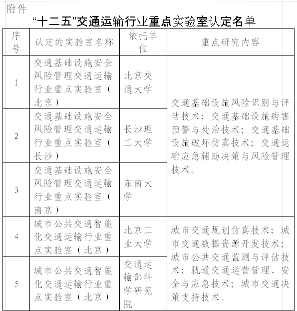 请各主管部门、依托单位按照《交通行业重点实验室管理办法》的要求,明确职责,强化管理,落实重点实验室建设和运行相关保障条件与支持政策,加快重点实验室建设与发展,提升重点实验室研发能力和水平。 为贯彻落实《交通运输部关于科技创新推动交通运输转型升级的指导意见》(交科技发〔2013〕540号)精神,加强交通运输科技创新体系建设,根据《公路水路交通运输“十二五”科技发展规划》确定的任务,部于2014年5月至2015年9月组织开展了“十二五”交通运输行业重点实验室认定工作。按照规定程序,形成了“十二五”交通运输行业重点实验室认定结果,现予公布(名单附后)。